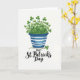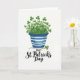 This St. Patrick's Day card features a watercolor pot overflowing with shamrocks, their leaves layered in many greens from deep emerald to bright lime 💚. The clovers spill outward in soft, see-through washes, like they’re leaning toward you the way close friends lean in for a photo. The pot is painted a rich blue with crisp white horizontal stripes, giving the scene a cozy, seaside touch. Everything sits on a wide white background, leaving lots of open space that makes the greens and blues stand out. A single slender shamrock stem slips from beneath the pot and curves downward, like a gentle hand reaching toward the message ☘️. Centred below the illustration, the phrase “Happy St. Patrick’s Day” appears in flowing black lettering, with the curve of the stem pointing right to it. The last clover on that stem hangs just above the words, its three small leaves tilted slightly to the right.