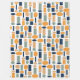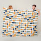 This large fleece blanket has a mid-century modern design of ovals and rectangles in patterns repeating in the design.
