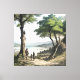 Three travelers gaze upon a tranquil lake nestled between distant mountains, shaded by ancient trees. Rendered in coloured engraving style, the artwork evokes nostalgia, human connection, and inner journey. Classic aesthetics with contemporary soul—perfect for sustainable tourism, education, cultural heritage, or mindful wellness brands.