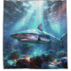 This shower curtain has a shark pictured on it.