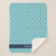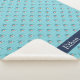Cute shark themed blanket features a pattern of smiling sharks swimming in a blue ocean. Personalize with child's name in white on a navy blue stripe along the bottom.