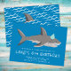 This fun kids birthday party invitation features a shark illustration with a bold blue background and casual, distressed fonts. It's a great choice for a boys birthday party. See the collection for coordinating items!