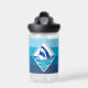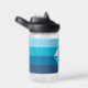A shark illustration with a background of horizontal lines in different shades of blue covering around the bottle, on the back you can customize