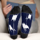 Fun socks printed with shark egg cases (also known as mermaid's purses). The weathered look egg cases are patterned over a navy blue background.