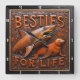 This highly dimensional square wall clock features a unique illustration of a brown shark with an open, toothy mouth and a happy brown seal swimming side-by-side. The entire design is rendered in rich brown and orange tones, strongly suggesting a deep carved relief or Engraved Wood Look. The shark has detailed gills and fins, while the seal appears cheerful with a smile. They are surrounded by an elaborate swirling, aquatic pattern carved into the dark wood background. The carving style gives the entire image a strong three-dimensional, sculpted quality. The large, three-dimensional embossed text "BESTIES FOR LIFE" is carved across the top and bottom of the artwork. The clock face features a simple clock face border with large, white, numbered tick marks (1 to 12) integrated into the outer frame. The artwork is surrounded by a thick, dark brown decorative border that resembles a black wood frame.