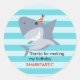 Cute shark theme birthday favour sticker featuring an illustration of a shark jumping in air with a grin and wearing a party hat. The background is blue stripes. The text says "thanks for making my birthday sharktastic."
