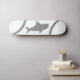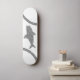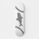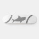 A skateboard deck with a silver shark on a white background. The shark and curved lines have a silver glitter look. (The glitter is a simulated image and not actual foil glitter)