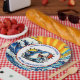 Boy's birthday party in a nautical or maritime theme paper plates. Blue, yellow, red shark pop art. Add child's name in the personalize area.
