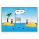 Your serve! This funny cartoon shows two castaways playing volleyball on their own personal islands with a sea of sharks waiting for one to come after a stray ball! With the caption "Your Serve." Funny and beautiful with a cool blue sea and sky.