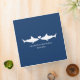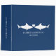 A wedding binder with navy blue background and white shark silhouette, couple's names and a heart.