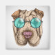 This design features a portrait of a Sharpei dog wearing teal tinted glasses.