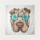 This design features a portrait of a Sharpei dog wearing teal tinted glasses.