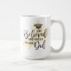This mug design features a watercolor painting of a girl with light skin and brown hair with a blue dress and a graduation cap holding balloons, flowers and her diploma rolled up. You can add a name to the front. The back design features the quote "She believed she could, so she did" in script and serif type over faux gold glitter. A graduation cap and tassel on top of the quote complete the design.