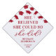 Celebrate your graduation in style with our unique red & white graduation cap topper. Embellished with a rain of mortarboard caps, it showcases the empowering quote 'she believed she could so she did'. Personalize it with your name and class year and make your graduation day truly unforgettable. This cap topper is not just an accessory but a memento of your hard work, determination, and achievement that led you to this special day.