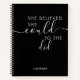 This modern design features the text "She Believed She Could So She Did" in modern grey and white typography on a black background with your personalized name below. Personalize by editing the text in the text box provided.