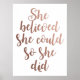 ♥ Inspirational Print "She Believed She Could So She Did" Rose Gold Print, Home Bedroom Decor, Motivational Poster. From extra small to maximum size available. ♥