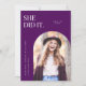 Modern graduation announcement card featuring a violet arch frame for your photo. The text says "SHE DID IT."