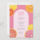 Whimsical citrus fruit in pinks, coral, orange and ruby red grapefruit colours. The hand drawn citrus slices include a watercolor painted texture for a juicy addition to a colourful wedding shower invitation.