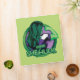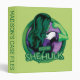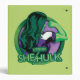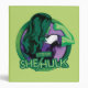 Circular badge with caricature of She-Hulk flexing in side profile.