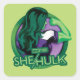 Circular badge with caricature of She-Hulk flexing in side profile. | For non-commercial personal use only.