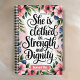 A watercolor illustration with a floral border. Inside the border, there's bold calligraphy text that says "She is clothed in strength and dignity Proverbs 31:25 ". The text is in an elegant style. The background is a soft pink.