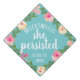 Cute grad cap topper features "nevertheless, she persisted" in white brush script lettering on a vibrant turquoise background adorned with pink watercolor flowers and green foliage. Personalize with your class year.