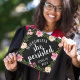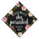 Cute grad cap topper features "nevertheless, she persisted" in white brush script lettering on a black background adorned with pink watercolor flowers and green foliage. Personalize with your class year.