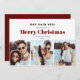 A modern " She said yes!" " Merry Christmas" 3 photo collage Christmas engagement announcement card. The design features modern typography . On the rear side of the card, the design features festive colour and more customizable text.