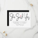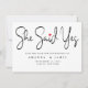 Modern minimalist black she said yes script save the date card. This elegant card features of handwritten script in black colour with cute red heart above ''she said yes'' text on white background and wedding details and names written in capital lettering in black colour. Back of the card is deep black. To edit this template click customize further.