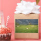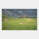 Rectangular photo sticker with some sheep in the green grass in front of three windmills under a dark sky with rain clouds just before a spring storm in a landscape in Leidschendam, the Netherlands.