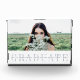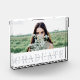 Modern graduation photo block features your favourite landscape oriented or horizontal photo on the front, with "graduate" displayed beneath in elegant grey-blue lettering. Personalize with your name, school and graduation year on a sheer white stripe overlay.