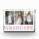 Modern graduation photo block features three of your favourite photos aligned side by side, with "graduate" displayed beneath in elegant bright pink lettering for a chic pop of colour. Personalize with your name, school and graduation year on a sheer white stripe overlay.