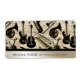 This fun music themed design features a variety of instruments on a vintage sheet music, collage background. The trendy black and gold colour palette makes an eye-catching shipping label. The instruments featured are: acoustic and electric guitar, saxophone, clarinet, trombone, trumpet, French horn, flute, violin, cello, and drums. Search ID481 to see other colour choices and products with this pattern.
