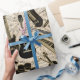 All the members of the band have come out to play on this fun music themed design that features a variety of instruments on a vintage sheet music, collage background. The trendy black and gold colour palette makes an eye-catching wrapping paper. The instruments featured are: acoustic and electric guitar, saxophone, clarinet, trombone, trumpet, French horn, flute, violin, cello, and drums. Search ID481 to see other colour choices and products with this pattern.