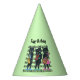 This paper party hat is light green with a sheet of black music notes and three black cat musicians with green eyes playing a guitar, saxophone, and violin in colourful clothing. Customise the Happy Birthday text with the template.