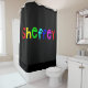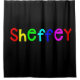 Imaging giving this bright primary coloured fonts shower curtain showcased on a bold, black background for anyone with the last name of Sheffey. Especially great in a dorm room or assisted living facility.