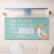 beach cottage theme desk mat with customizable "may you always have a shell in your pocket and sand in your shoes" text in modern script white font, blue background and watercolor message in a bottle sea life graphic