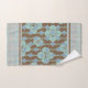 Shell We? Bath Towel Set. Colourful blue teal, purple, and brown. Accenting the set is cross currents in Teal Blue, grey, and pink. Ocean, seashore, nautical, beach house inspired bathroom decor.