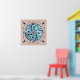 An abstract, 4-sided mandala design in navy blue on pale terracotta. This design is composed of symbols inspired by Native American glyphs and sand paintings. All the items have meaning, having to do with healing, long life, protection, strength, time and constancy, earth, and sun. All set over a blue full moon.
