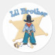 Cute Sheriff little brother with stick horse standing in front of a large gold sheriff star, text reads 'Middle Brother'. Has matching big brother and middle brother designs. brother brothers kewlkids little+brother siblings cute