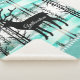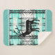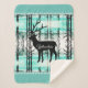 This warm and cozy Sherpa blanket is shown in a pretty forest Yellowstone Deer print with details of smaller sized lodge-style tree images along the solid colour aqua coloured border with grey accent stripes.