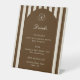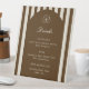 Birthday drinks menu sign featuring a hand-drawn coffee mug paired with elegant script and serif fonts in which your personalized information is written. The background is brown stripes on a light background. Check out our store for more items from this collection.