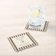 Birthday paper coaster featuring a hand-drawn coffee martini glass and coffee beans paired with elegant script and serif fonts in which your personalized information is written. The background is brown stripes on a light background. Check out our store for more items from this collection.