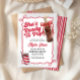 This editable soda pop baby shower invitation features a charming retro theme with a hand-drawn red coquette bow, making it the perfect "She's Ready to Pop" announcement for your upcoming celebration.