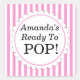 She's Ready to Pop Baby Shower Sticker with stripes. Customize with the mother-to-be's name! Perfect for baby shower favours, treats, and more.