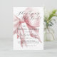 Simple and beautifully feminine, this bridal shower invitation exudes elegance showcasing a large luxurious pastel pink watercolor bow as its centerpiece. The bow is angled and slightly off-centre, appearing soft and flowing with delicate shadows giving a 3-D effect. It stretches gracefully across the invitation symbolizing the act of "tying the knot." The plain white background adds a style of simplicity and sophistication. A font pairing of modern handwritten script and elegant serif presents your text beautifully. Simply personalize the template with your event details.