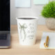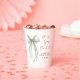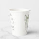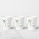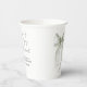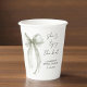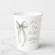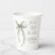 Elegant bridal shower paper cups featuring a beautiful watercolor of a sage green bow, "She's tying the knot" in a chic calligraphy script, and the bride's name and shower date in simple modern lettering.