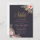 Get ready for a surprise birthday party with this elegant design. This invitation features watercolor rose bouquets in the top right and bottom left corners with a deep off-black background, elegant gold glitter hand-lettering style script for the "Shhh!" with a pink polka dot and floral pattern on the back. Add your own details by clicking the "personalize this template" button and typing into the text boxes and remember, keep quiet!