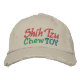 Name your Dog ! Actually, my Shih Tzus (Big Jake, Southern Sadie, and Gutsy Gogee) don't chew on my cap. They go wild when I put it on, because it signifies "going for a walk". If I want to wear it just to do yard work, I have to sneak the cap outside under my shirt. Thanks and enjoy ! Take your friend for a walk ... : ) Sharon Rhea Ford (www.zazzle.com/sharonrhea*)