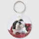 Black and white Shih Tzu in red garland Christmas photo keychain